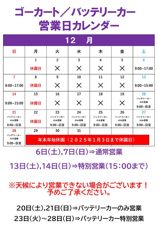 ゴーカート・バッテリーカー 12月・1月営業スケジュールについて